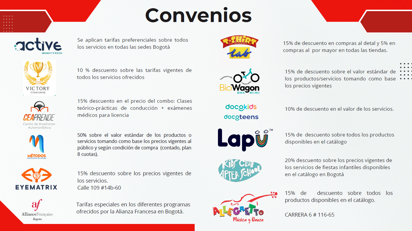 Podrás contar con el seguro educativo de tus hijos a tasas preferenciales para afiliados -10% dcto. Además, podrás acceder al plan de ahorro programado para la estadía lingüística a través de SKANDIA.